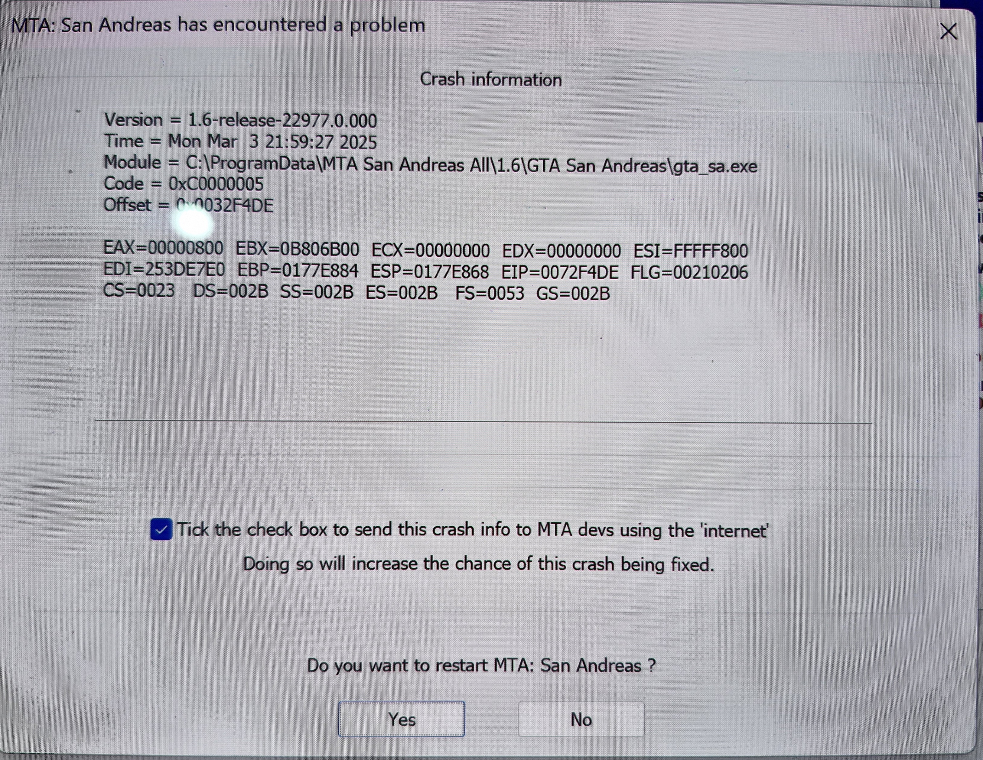 Motamt Posted March 14 Share Posted March 14 Hello, I have been having technical problems with MTA for some time now and I can't even play for 5 minutes. I keep getting thrown out of the launcher, please help me to solve this problem, thank you https://biaupload.com/do.php?imgf=org-e07e6254b69a2.jpg https://biaupload.com/do.php?imgf=org-0d59510ba63d1.jpg @Patrick @IIYAMA @Vinyard Link to comment