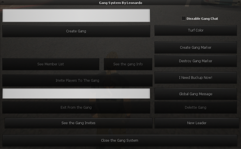 Leonard.DC Posted May 2, 2014 Author Share Posted May 2, 2014 The gang system screenshot, It have a easy turf color changer, nice chatbox colours and exelent mysql system, 0 bugs detected, 100% completed, easy to configure, and some nice stuff like gang oficial marker to reunions, with gang blips and playerblips (present), and do not forget the rank system for the members global messages and ask for buckups that posts to only all members from the gang Later i will post the turf system screenshots PD: Open the full image Link to comment